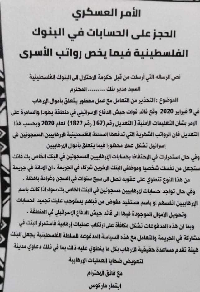 وافادت بعض عائلات الاسرى،أن ادارة البنوك طالبتهم بعمل براءة ذمة، واغلاق حساباتاهم وسحب اموالهم.