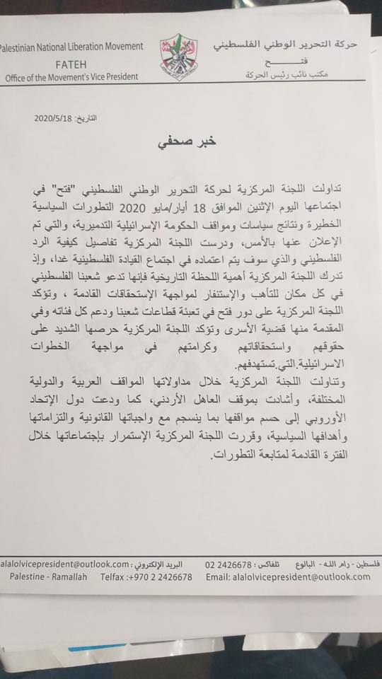 صدى نيوز: تداولت اللجنة المركزية لحركة التحرير الوطني الفلسطيني "فتح" في اجتماعها اليوم الإثنين الموافق 18 أيار/مايو 2020 التطورات السياسية الخطيرة ونتائج سياسات ومواقف الحكومة الإسرائيلية التدميرية، والتي تم الإعلان عنها بالأمس، ودرست اللجنة المركزية تفاصيل كيفية الرد الفلسطيني والذي سوف يتم اعتماده في اجتماع القيادة الفلسطينية غدا.