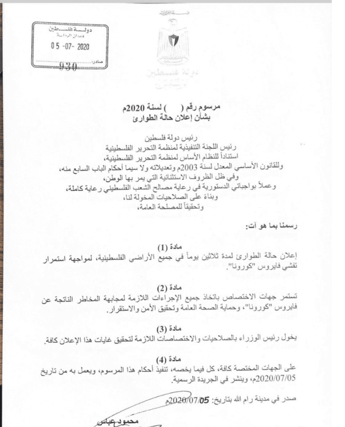 صدى نيوز: أصدر الرئيس محمود عباس، اليوم الأحد، مرسوما بتمديد حالة الطوارئ لثلاثين يوما تبدأ من اليوم، لمواجهة استمرار تفشي فيروس كورونا.