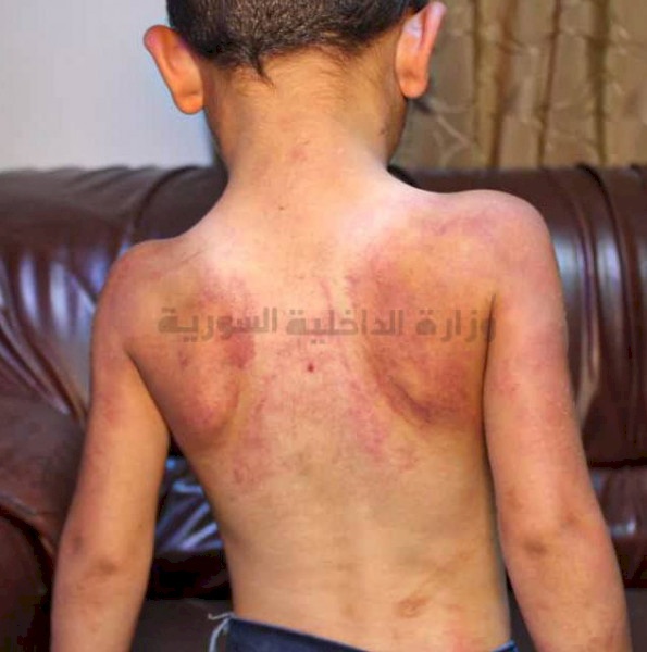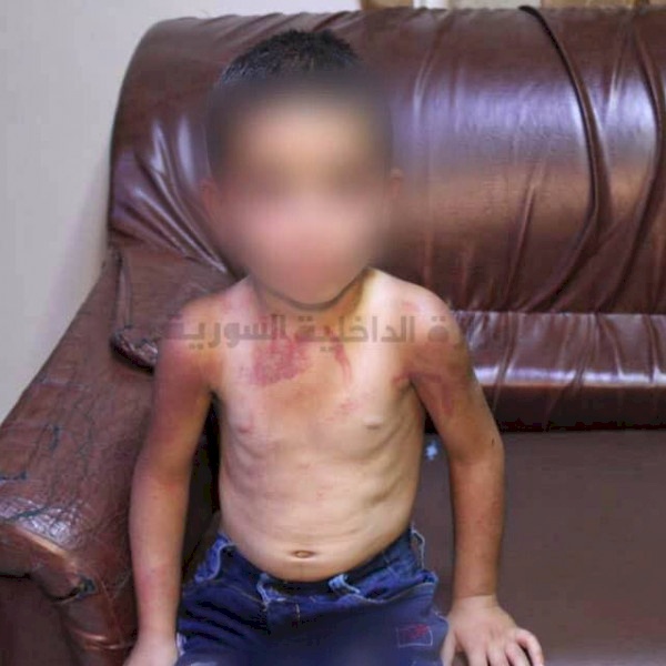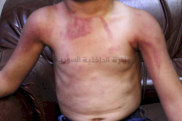وذكرت وزارة الداخلية السورية في بيان نشرته عبر صفحتها على "فيسبوك"، إن "جد الطفل أبلغ الشرطة بأن ابنته تعذب حفيده عبر ضربه بالأحذية البلاستيكة على كافة أنحاء جسده وتقوم بإشهار سكين لتخويفه كما تقوم بحرقه بالشتاء بالمدفئة وتعنيفه بشكل مستمر منذ حوالي السنة تقريبا".