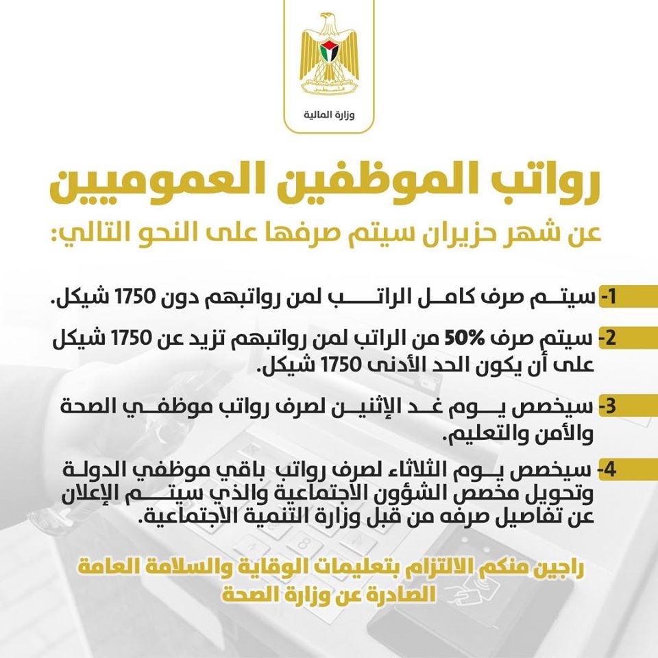 وقالت المالية في رام الله انه سيتم صرف راتب كامل لمن رواتبهم دون 1750 شيكل ، فيما سيتم صرف 50% من الراتب لمن رواتبهم تزيد عن 1750 شيكل على ان يكون الحد الادنى 1750 شيكل.