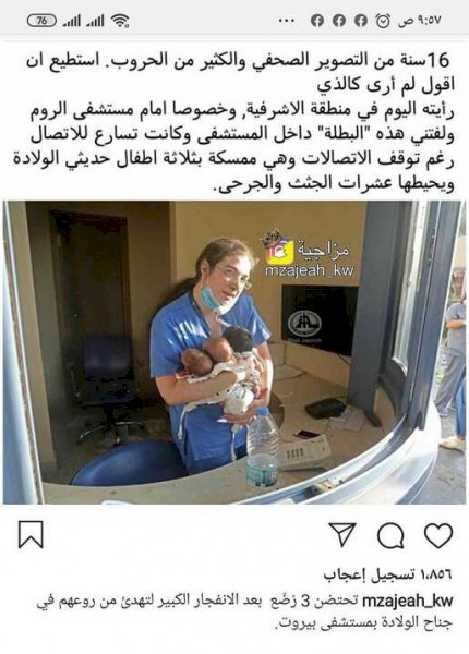 وظهرت الممرضة، وهي تحمل في أيديها ثلاثة أطفال رضع، وتقوم بتهدئة روعهم، أثناء انفجار مرفأ بيروت، رافضة ترك الرُضّع رغم الوضع الصعب، الذي حدث في لبنان، والخوف الذي كان سائدًا.