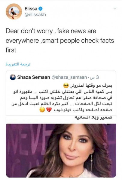 وعبر حسابها بموقع (تويتر)، علقت إليسا بالقول: "الأخبار المزيفة موجودة في كل مكان، والأذكياء يتحققون من الحقائق أولاً".