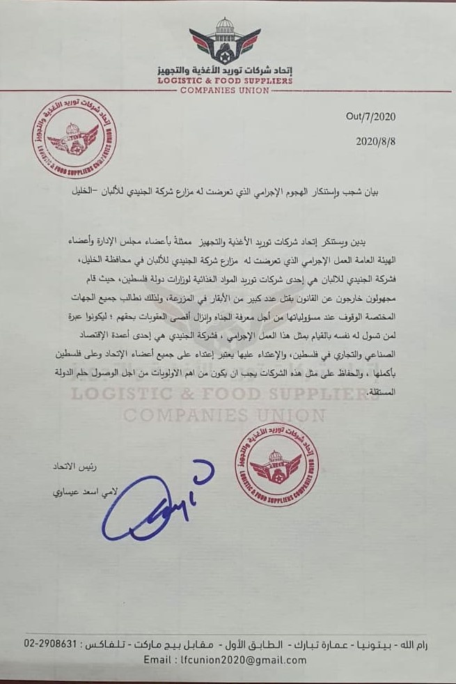 يدين ويستنكر اتحاد شركات توريد الاغذية والتجهيز ممثل بمجلس الادارة وأعضاء الهيئة العامة ومصنعي الاغذية يستنكر العمل الاجرام غير الإنساني الذي تعرضت له مزرعة الوفاق التابعة لشركة الجنيدي لتصنيع الالبان، والذي أدى إلى خسارة اكثر من 100 رأس بقري من خلال نفوق اكثر من 60 رأس بقري وإصابة 40 رأس بقري لإنتاج الحليب الخام الخاص بالصناعة الفلسطينية.