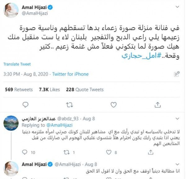 وقالت أمل حجازي: "في فنانة منزلة صورة زعماء بدها تسقطهم وناسية صورة زعيمها ياللي راعي الدبح والتفجير بلبنان.. لاء يا ست ما نقبل منك هيك صورة لما بتكوني فعلا مش غنمة زعيم .. كتير وقحة".