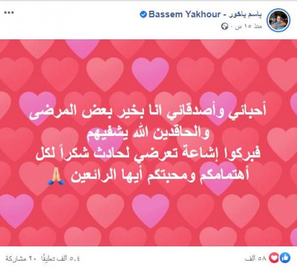 وكتب باسم عبر حسابه على حسابه بموقع (انستغرام): "أحبائي وأصدقائي أنا بخير بعض المرضى والحاقدين الله يشفيهم فبركوا إشاعة تعرضي لحادث شكراً لكل اهتمامكم ومحبتكم أيها الرائعين".