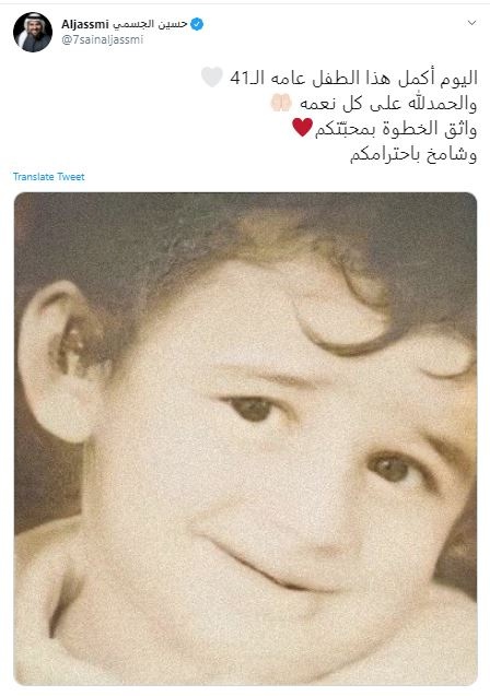 ونشر حسين الجسمي، عبر حسابه بموقع تويتر، صورة في فترة الطفولة وعلق قائلاً:" اليوم أكمل هذا الطفل عامه الـ41 والحمد لله على كل نعمة واثق الخطوة بمحبّتكم وشامخ باحترامكم".