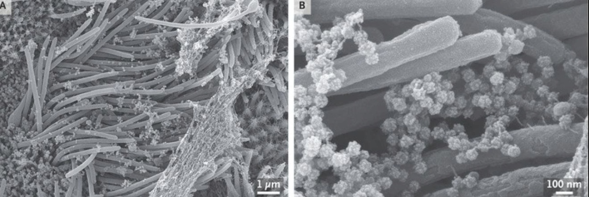 كما يستخدم الفيروس تلك الأشواك لغزو الخلايا البشرية، وتُظهر الصورة أيضا كثافة عالية من جزيئات الفيروس داخل المجاري التنفسية البشرية.