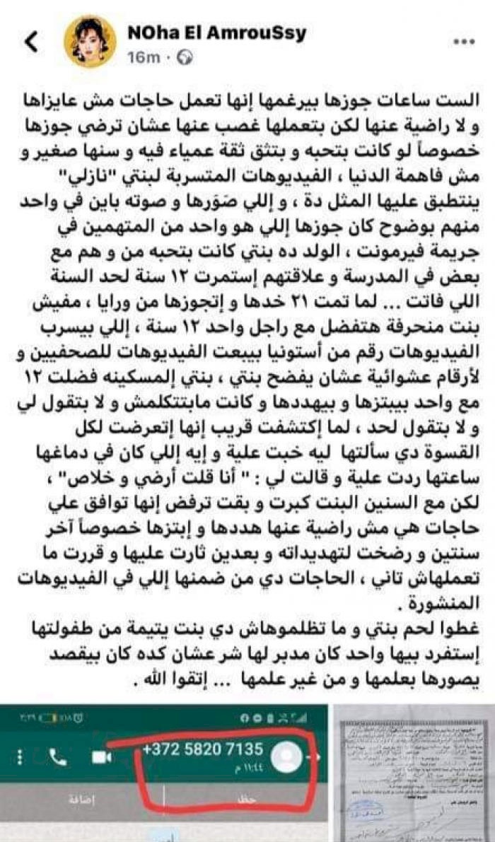 نهى نشرت عبر حسابها بموقع التواصل الاجتماعي الفيس بوك منشورا مطولا للدفاع عن ابنتها، ويبدو أنها تلقت نصيحة عاجلة بحذفه حتى لا تتهم بالتأثير على أعمال القضاء، وأكدت فيه العمروسي ان المرأة تجبر أحيانا على القيام بأفعال مشينة تلبية لرغبة زوجها، ودعمت منشورها بصورة ضوئية من وثيقة زواج ابنتها مع الرقم الذي يتعمد إرسال المقاطع الفاضحة.وأضافت: الست ساعات جوزها بيرغمها إنها تعمل حاجات مش عايزاها ولا راضية عنها، لكن بتعملها غصب عنها عشان ترضي جوزها خصوصا لو كانت بتحبها وبتثق ثقة عمياء فيه، وسنها صغير ومش فاهمة الدنيا وتابعت قائلة: الفيديوهات المسربة لابنتي نازلي، ينطبق عليها المثل ده، واللي صورها وصوته باين في واحد منهم بوضوح كان جوزها اللي هو واحد من المتهمين في جريمة فيرمونت الولد ده بنتي كانت بتحبه من وهما مع بعض في المدرسة وعلاقتهم استمرت 12 سنة لحد السنة اللي فاتت لما تمت 21 سنة خدها واتجوزها من ورايا.
