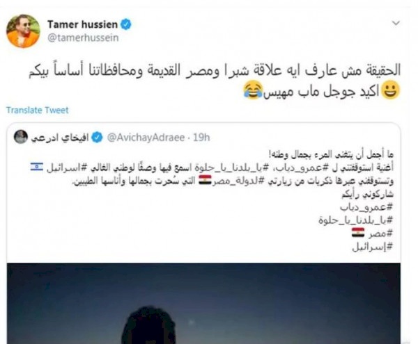 فكتب في تغريدته قائلا: "ما أجمل أن يتغنى المرء بجمال وطنه .. أغنية استوقفتني ل عمرو دياب .. يا بلدنا يا حلوة .. اسمع فيها وصفا لوطني الغالي إسرائيل"، وفق ما نقلته (نورت).