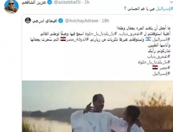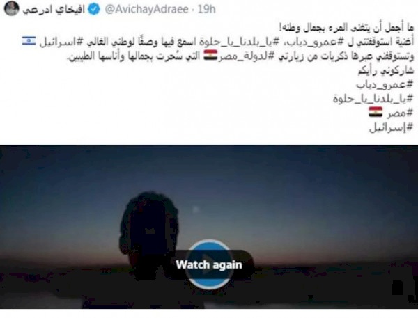 صدى نيوز -نشر المتحدث الرسمي بإسم الجيش الإسرائيلي (أفيخاي أدرعي) تغريدة له عبر حسابه على موقع تويتر أبدى من خلالها إعجابه بأغنية (يا بلدنا يا حلوة) للفنان المصري (عمرو دياب).