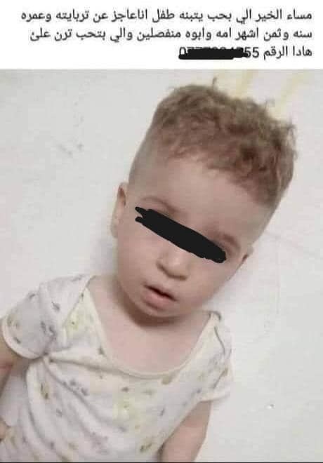 وتداول رواد مواقع التواصل الاجتماعي في الأردن يوم الأربعاء إعلاناً جرى نشره بموقع التواصل الاجتماعي "فيسبوك"، تضمن عرض طفل للتبني لمن يرغب وذلك بسبب انفصال والديه، وعدم رعايتهم له.