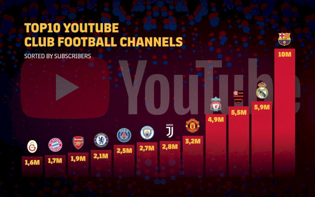 ويبتعد برشلونة في صدارة قائمة عدد مشتركي الأندية الرياضية على "يوتيوب" بفارق كبير عن أقرب ملاحقيه الغريم التقليدي ريال مدريد الذي يمتلك 5.9 مليون مشترك.