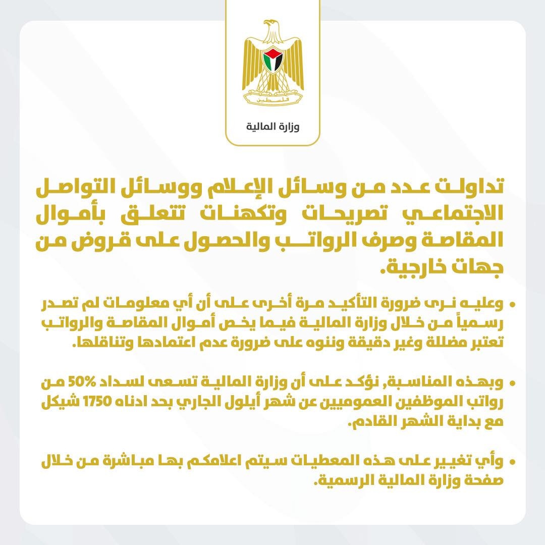 وتابعت أي معلومات لم تصدر رسمياً من خلال وزارة المالية فيما يخص أموال المقاصة والرواتب تعتبر مضللة وغير دقيقة وننوه على ضرورة عدم اعتمادها وتناقلها.