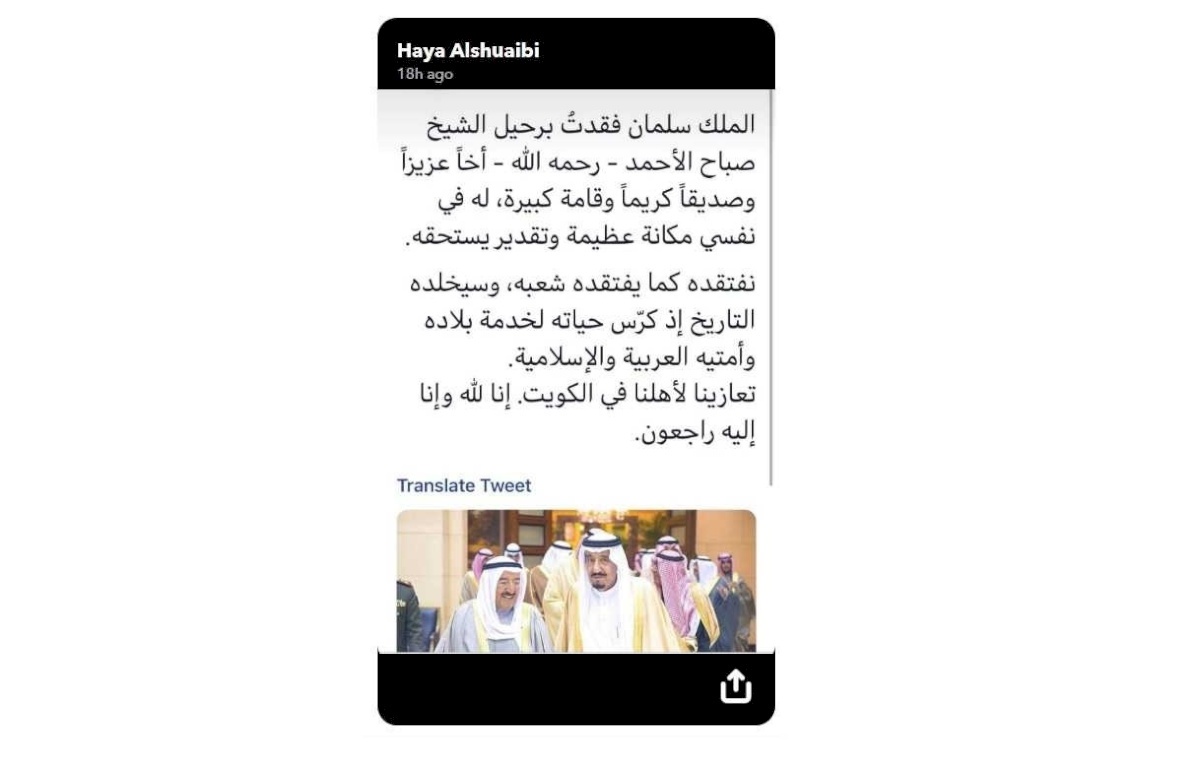 ووفق ما أورد موقع "الحرة"؛ جاء هذا الغضب السعودي، رغم أن الفنانة الكويتية نشرت صورة أخرى لأمير الكويت الراحل مع الملك سلمان بن عبد العزيز مع عبارات العزاء التي قالها العاهل السعودي في الشيخ صباح الأحمد الصباح.