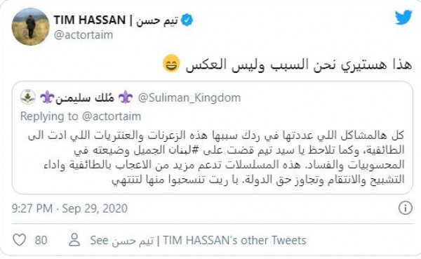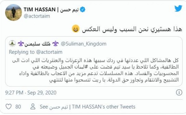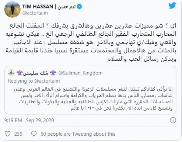 وردا على متابعة طالبته بالتوقف عن نشر"مسلسلات الزعرنة والتشبيح في العالم العربي" قال تيم حسن: "اي ؟ شو مميزات عشرين عشرين وهالشرق بشرفك ؟ المفتت الجائع المحارب المتحارب الفقير الجائع الطائفي الرجعي الخ .. فيكي تشوفيه واقعي وفيك/ي تهاجمي وبالاخر هو شقفة مسلسل ؛ عند الاجانب بالمئات من هالاعمال والمجتمعات مستقرة نسبيا عندنا قايمة القيامة وبدكن رسائل الحب والسلام".