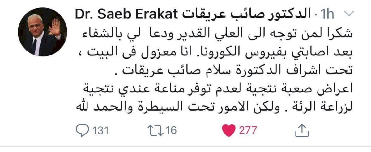 وكانت أمانة سر اللجنة التنفيذية لمنظمة التحرير،قد اعلنت مساء امس الخميس إصابة صائب عريقات بفيروس (كورونا).