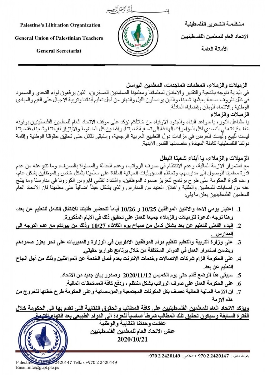 وطالب الاتحاد في بيان صحفي نشره في 21 من الشهر الجاري وزارة التربية والتعليم بتنظيم دوام الموظفين الإداريين في الوزارة والمديريات على نحو يضمن استمرار العمل في دوائر مختلف وفق برنامج طوارئ حقيقي، ودعا الحكومة إلى إلزام شركات الاتصالات وخدمات الإنترنت بعدم فصل الخدمة عن المواطنين لضمان نجاح التعلم عن بعد، والذي سيستمر حتى الخميس 12\11\2020 وصدور بين جديد.