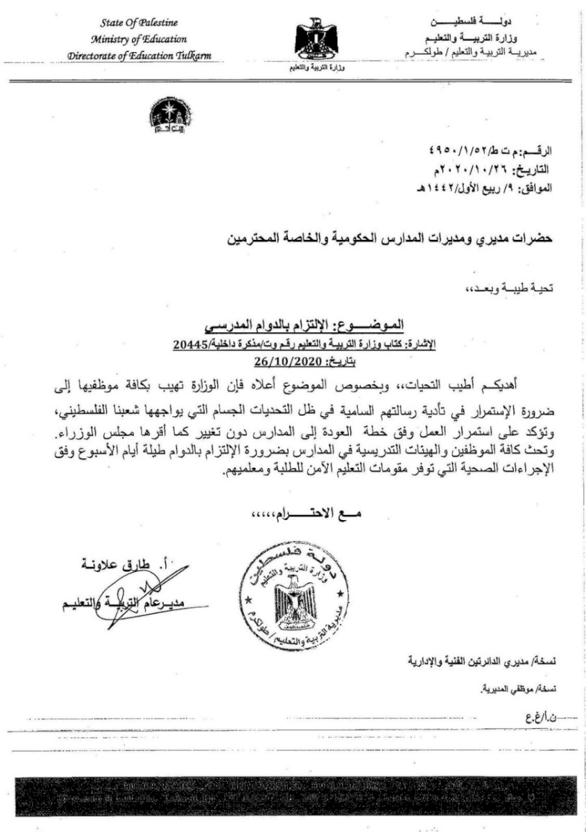 وأهابت الوزارة في تعميم بعثت به مديريات التربية للمدارس "بكافة موظفيها إلى ضرورة الاستمرار في تأدية رسالتهم في ظل التحديات الجسام التي يواجهها شعبنا، وتؤكد استمرار العمل بخطة العودة إلى المدارس دون تغيير كنا أقرها مجلس الوزراء، وتحث كافة الموظفين والهيئة التدريسية بضرورة الإلتزام بالدوام طيلة أيام الأسبوع وفي الإجراءات الصحية التي توفر العودة الآمنة".