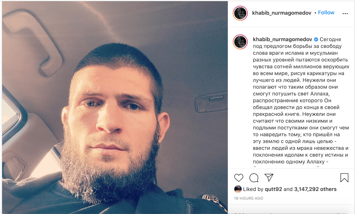 صدى نيوز: أثار الروسي حبيب نورمحمدوف بطل اتحاد " UFC" للفنون القتالية المختلطة، مجددا موضوع الرسوم المسيئة، غداة هجوم شنه على الرئيس الفرنسي إيمانويل ماكرون.