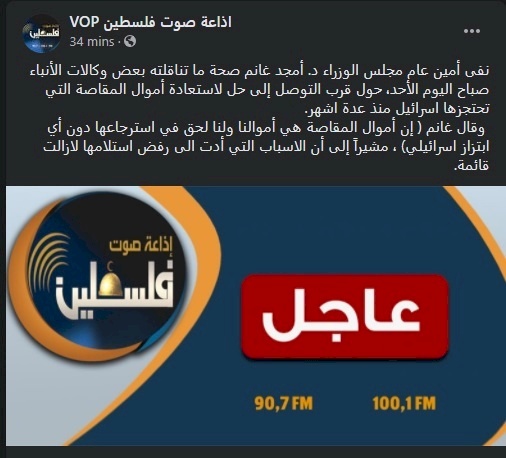 وكانت عدة وسائل اعلام قد تداولت خبرا صباح اليوم على لسان أمين عام مجلس الوزراء امجد غانم ان مشكلة المقاصة مع الاحتلال في طريقها للحل، وان الحكومة تأمل ان تستلم اموال المقاصة خلال شهر تشرين ثاني الجاري وانه من المتوقع ان يتم دفع الرواتب كاملة لكافة الموظفين العموميين وليس المعلمين فقط"، وهناك جهود تبذل في هذا الملف، وان شاء الله يكون لدينا قدرة نهائية في شهر 11 على الانتهاء من ابتزاز الاحتلال وان نسترجع اموال المقاصة.