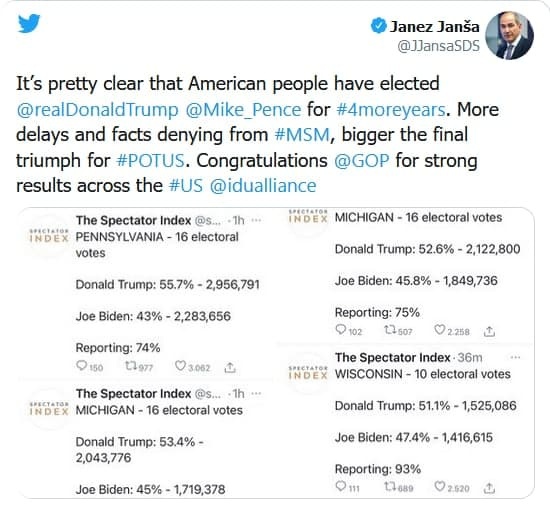 وقال رئيس الحكومة السلوفينية في تغريدة على صفحته الشخصية على وسائل التواصل الاجتماعي "تويتر": "من الواضح تماماً أن الشعب الأمريكي انتخب دونالد ترامب ومايك بنس لأربع سنوات أخرى".