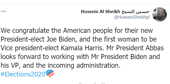 واضاف الشيخ يتطلع الرئيس عباس إلى العمل مع الرئيس بايدن ونائبه والإدارة القادمة.