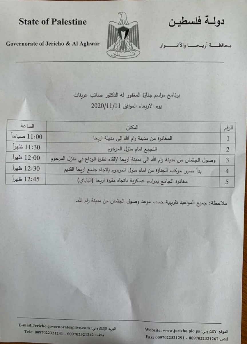 وأضاف: "ثم يسجٌى جثمانه لالقاء نظرة الوداع الأخيرة من قبل الرئيس محمود عباس ، والقيادة الفلسطينية قبل أن ينطلق الجثمان من مقر الرئاسة في رام الله الى مدينة اريحا للصلاة عليه وموارته الثرى".