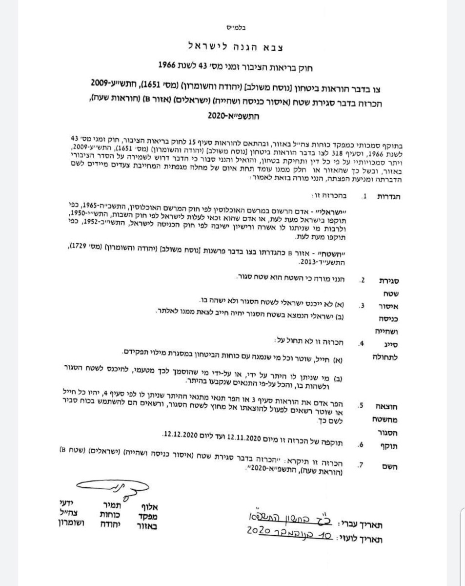 صدى نيوز: أصدر جيش الاحتلال الإسرائيلي أمراً عسكرياً يمنع فلسطينيي عام 1948 من دخول الأراضي الفلسطينية (المصنفة ب) على خلفية تفشي فيروس كورونا في الضفة ابتداءً من يوم الخميس القادم ولمدة شهر.