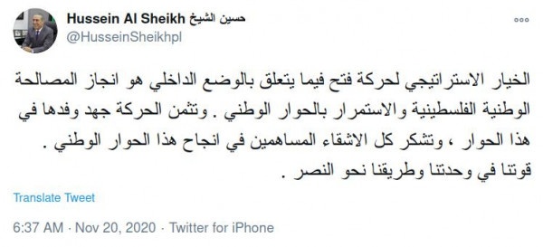 الشيخ: خيار (فتح) الإستراتيجي هو إنجاز المصالحة والاستمرار بالحوار الوطني