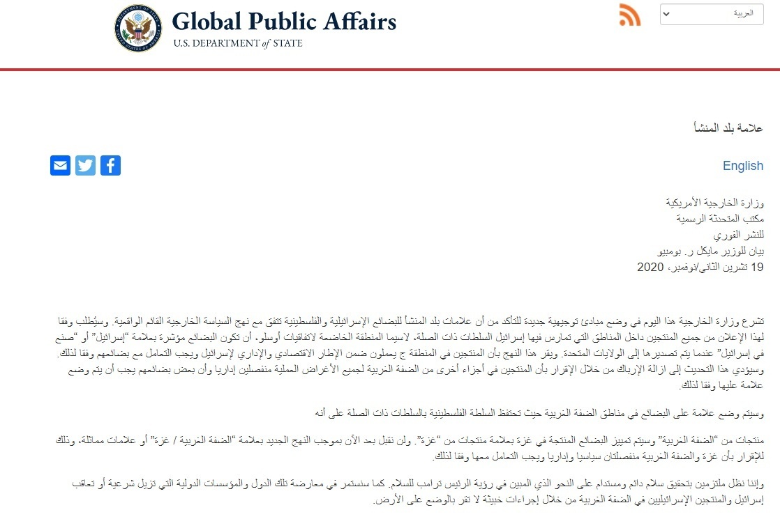 واضاف بيان الخارجية الامريكية "وسيتم وضع علامة على البضائع في مناطق الضفة الغربية حيث تحتفظ السلطة الفلسطينية بالسلطات ذات الصلة على أنهمنتجات من “الضفة الغربية” وسيتم تمييز البضائع المنتجة في غزة بعلامة منتجات من “غزة”. ولن نقبل بعد الآن بموجب النهج الجديد بعلامة “الضفة الغربية / غزة” أو علامات مماثلة، وذلك للإقرار بأن غزة والضفة الغربية منفصلتان سياسيا وإداريا ويجب التعامل معها وفقا لذلك".
