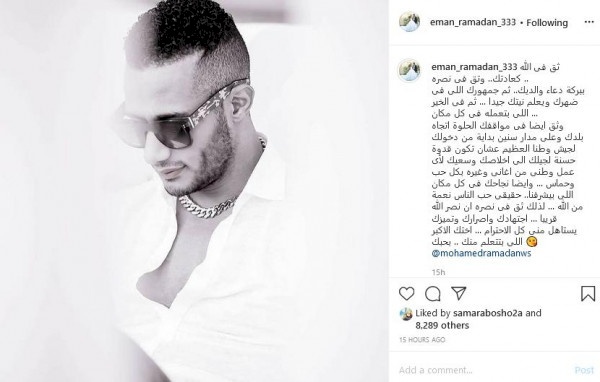 وأضافت إيمان رمضان: "وثق أيضاً في مواقفك الحلوة اتجاه بلدك وعلى مدار سنين بداية من دخولك لجيش وطننا العظيم عشان تكون قدوة حسنة لجيلك الى اخلاصك وسعيك لأي عمل وطنى من اغاني وغيره بكل حب وحماس،وأيضاً نجاحك في كل مكان اللي بيشرفنا".