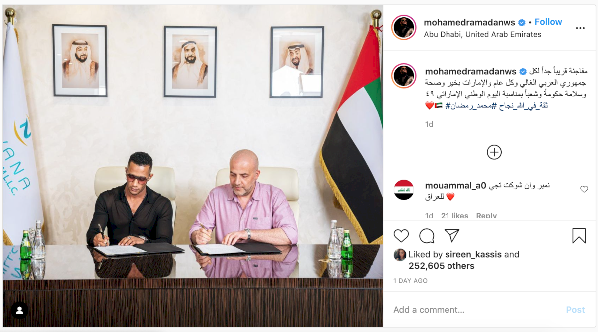وفاجأ محمد رمضان، جمهوره عبر حسابه الخاص على "إنستغرام" بصورة يوقع فيها على عقد جديد لم يكشف المزيد من التفاصيل مكتفياً بالتعليق: "مفاجأة قريباً جداً لكل جمهوري العربي الغالي وكل عام والإمارات بخير وصحة وسلامة حكومةً وشعباً بمناسبة اليوم الوطني الإماراتي 49".