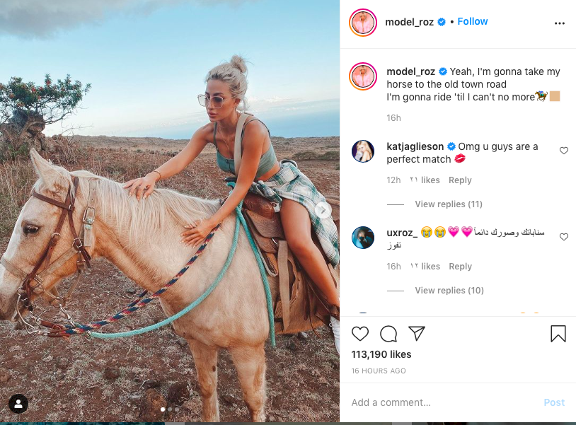 وظهرت مودل روز في جلسة التصوير التي نشرتها عبر “انستجرام”، وتابعتها صدى نيوز وهي ترتدي تيشرت أشبه بحمالات الصدر، وتُظهر فخذيها أثناء امتطاء الخيل، وفي أحد الصور تُظهر صدرها وإبطها بشكل واضح.وعلقت مودل روز على الصور قائلة: “أجل ، سآخذ حصاني إلى طريق البلدة القديمة، سأركبه، لا أستطيع أكثر”.