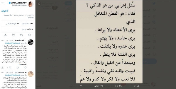 وفي تغريدة أخرى، طالعتها صدى نيوز كتبت الكيلاني "سُئل أعرابي من هو الذكي، فقال هو الفطن المتفائل، الذي يرى حاسده فلايهتم، يرى عدوه ولا يلتفت، مبتعداً عن القيل والقال، فيبيت وقلبه نقي ونفسه راضية، فلا تعب ولا فكر ولا كدر ولا هم"، بهذا الشكل تكون الكيلاني نفت انفصالها عن زوجها وبررت صمتهما.
