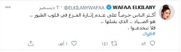 و بدأت وفاء بالخروج عن صمتها، بتمرير رسائل مبطنة، عبر تغريدات متفرقة على (تويتر)، فنشرت تغريدة تقول فيها: "أكثر الناس حرصاً على عدم إثارة الفزع في قلوب الطيور، هو الصياد، ليقتلها، فلا تنخدعوا"، هذه التغريدة جاءت مبطنة، فهل قدت بها تيم أم المدون إيلي الذي روج للخبر، هذا الأمر لم تجزمه الكيلاني.