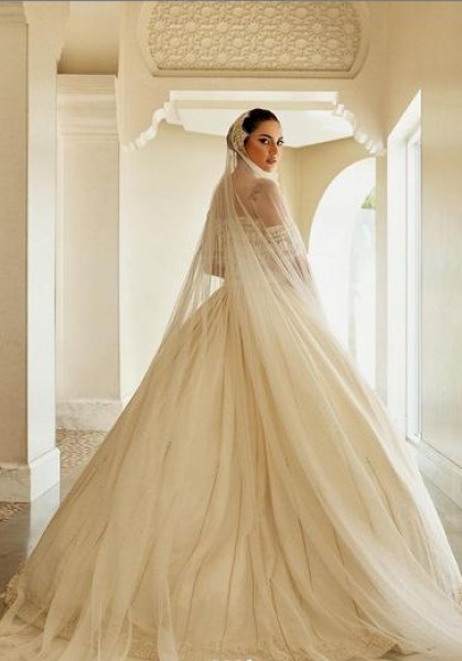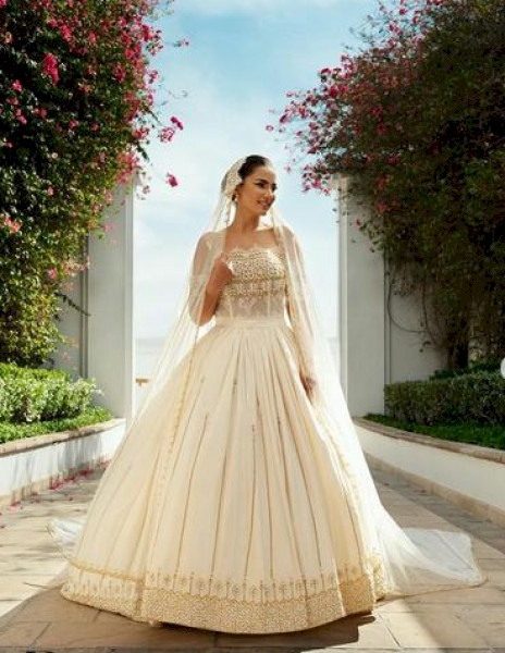 وفي وصف الفستان الفلسطيني، فقد انقسم التطريز إلى مجموعات، الأولى على الطرحة التي تزين الرأس والجزء العلوي من الصدر الذي تركز عليه الكثير من التطريز اليدوي المأخوذ من التراث الفلسطيني، وجاءت أطراف الفتسان مطرزة بنفس الشكل، وجاءت الألوان من درجات البيج ليتوائم من الحرير الأوف وايت.
