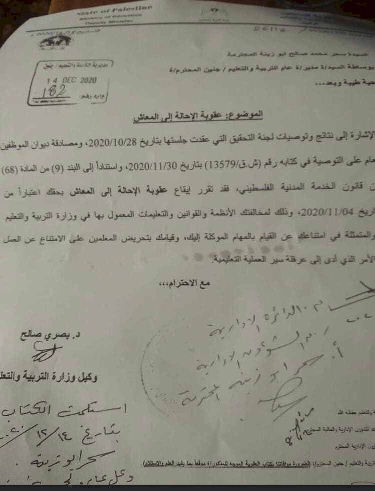 وبحسب كتاب إحالة المعلمة أبو زينة إلى التقاعد الذي اطلعت عليه صدى نيوز، فإن لجنة تحقيق شُكلت وعقدت جلستها في 28\10\2020 وبناء على نتائج التحقيق وتوصيات اللجنة تقرر "إيقاع عقوبة الإحالة إلى المعاش وذلك لمخالفة الأنظمة والقوانين والتعليمات المعمول بها في وزارة التربية والتعليم والمتمثلة في الامتناع عن القيام بالمهام الموكلة إليك، وتحريض المعلمين على الامتناع عن العمل الأمر الذي أدى إلى عرقلة سير العملية التعليمية".