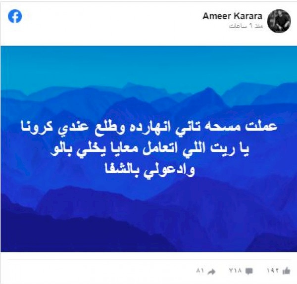 وكتب كرارة عبر حسابه الخاص على موقع (فيس بوك): "عملت مسحه تاني انهارده وطلع عندي كورونا، يا ريت اللي اتعامل معايا يخلي بالو، وادعولي بالشفا"، وفق (سيدتي).