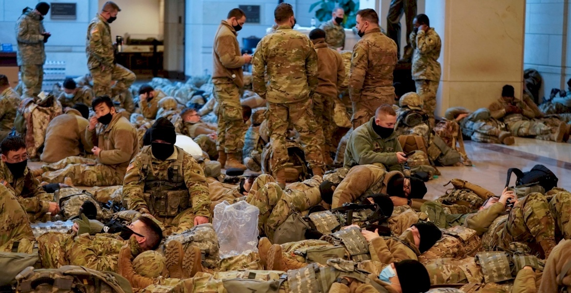 إذ أظهرت صورٌ نشرتها وسائل الإعلام الأمريكية،، جنود قوات الحرس الوطني الأمريكي وهم ينامون في أروقة مبنى الكونغرس، في إشارة إلى الأوضاع الأمنية المتوترة، في ظل مخاوف من حدوث انفلات أمني، خاصة خلال مناقشة مجلس النواب الأمريكي قضية عزل ترامب.