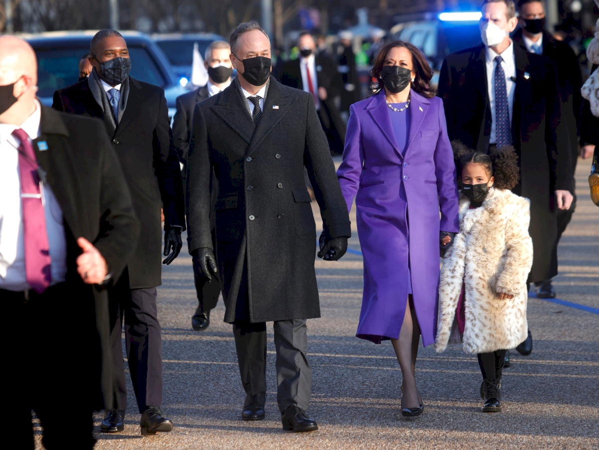 وتشاركت وزيرة الخارجية السابقة هيلاري كلينتون والسيدة الأولى السابقة ميشيل أوباما ذات اللون مع هاريس لكن بدرجات مختلفة، وهو لون يميز الحركة النسائية في الولايات المتحدة، لكن مراقبين فسروه أيضا بأنه رمز للوحدة بين الولايات الزرقاء المؤيدة للديمقراطيين والولايات الحمراء المؤيدة للجمهوريين، وهو موضوع رئيسي هيمن على مراسم التنصيب.