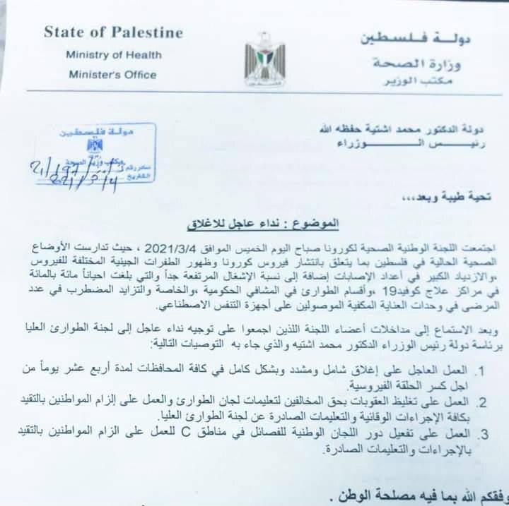 صورة- رسالة عاجلة من وزيرة الصحة لاشتية: نداء عاجل للإغلاق