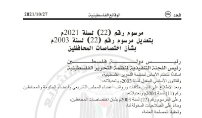 رام الله- خاص لـ صدى نيوز: نشرت جريدة الوقائع الرسمية عدد 184، مرسوم رقم 22 لسنة 2021 بشأن اختصاصات المحافظين، والتي حدد مدة خدمة المحافظين بخمس سنوات قابلة للتمديد لسنة واحدة فقط.