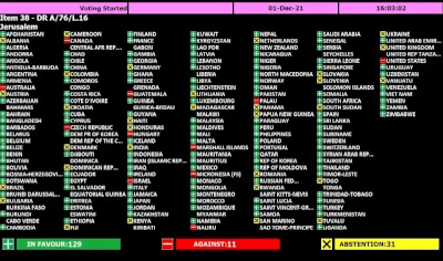 وحصل القرار الثاني المتعلق بالقدس الشرقية على موافقة 129 دولة واعتراض 11، من بينها الولايات المتحدة إسرائيل، وامتناع 31 عن التصويت.