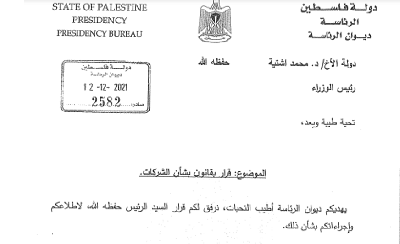متابعة صدى نيوز - نشرت وكالة صدى نيوز نص قرار بقانون بشأن الشركات الذي صدر عن الرئيس محمود عباس في أكتوبر الماضي، بدلا من قانون الشركات القديم النافذ منذ 1964.