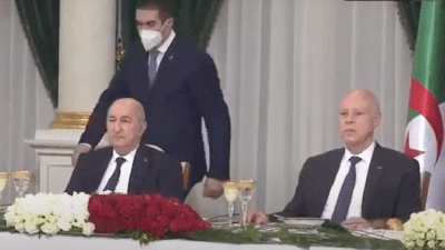 وفي المقطع، يظهر الرئيس تبون وهو جالس بين الرئيس قيس سعيد، ورئيسة الوزراء التونسية، نجلاء بودن، وعند تلقيه خبرا من مرافقه، يبتسم ويتحدث مع بودن، ومن ثم يكلم الرئيس قيس سعيد، ويبتسمان.