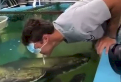 وحاول الناشط إطعام سمكة كبيرة في أحد الأحواض المائية من خلال إمساك سمكة صغيرة بفمه، مع وضع الكمامة على عينيه في محاولة تجنب المياه المتطايرة.