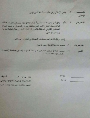 وتضمن الأمر العسكري الإسرائيلي الصادر منذ أيام وضع اليد وفق الأحكام العسكرية السارية في الضفة على جميع أراضي القريتين وتهديد سكانهما بمصادرة جميع ممتلكاتهم في حال لم يغادروا المنطقة خلال ثمانية أيام تنتهي مساء اليوم الجمعة.