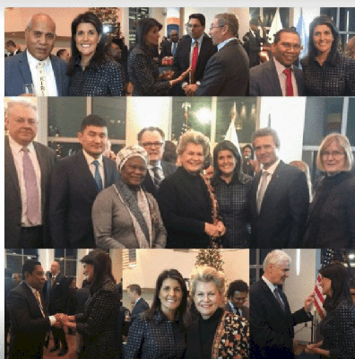 وتحت عنوان "سهرة استثنائية للأصدقاء"، قامت هايلي بنشر صور عدة على تويتر تظهر فيها محاطة بسفراء وسفيرات خلال حفل استقبال نظم في نيويورك.