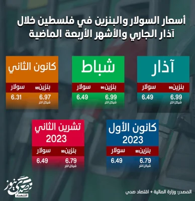 أسعار السولار والبنزين في فلسطين خلال آذار الجاري والأشهر الأربعة الماضية